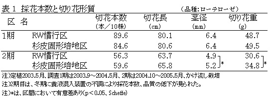 2年間の総切り花本数では、粉砕杉皮固形培地はロックウール慣行区とほぼ同数であり、切り花品質はロックウール慣行区と同等以上である(表1)。