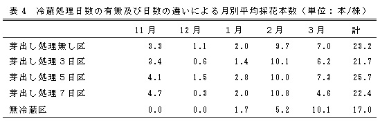 表4 冷蔵処理日数の有無及び日数の違いによる月別平均採花本数(単位:本/株)