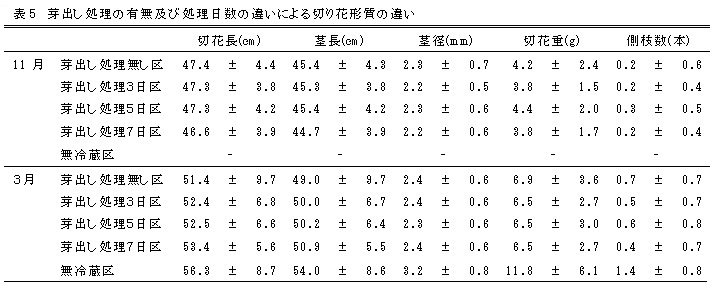 表5 芽出し処理の有無及び処理日数の違いによる切り花形質の違い
