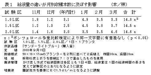 表1 給液量の違いが月別収穫本数に及ぼす影響(本/株)