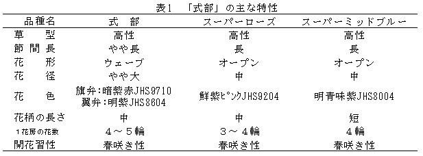 1998年春に春咲き系品種「アーリーサーモンピンク」(花色:鮮ピンク)と冬咲き系品種「ミセスダグラスマッカーサー」(花色:鮮ピンク)の組み合わせで交配を行った。その後F3において分離した系統の中から旗弁と翼弁の色が異なる濃赤味紫色の系統を選抜、更に自殖、選抜を繰り返し2002年にF5で固定した。その後現地での適応試験を行い、有望と認められたので育成を完了した。スイートピーの新品種「式部」を育成した。
