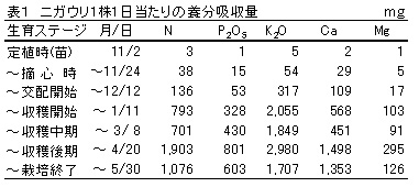 表1 ニガウリ1株1日当たりの養分吸収量