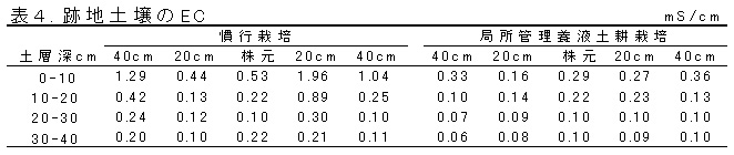 局所管理養液土耕栽培は、塩類集積の少ない環境保全型栽培法である(表3)。