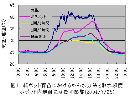 図1 紙ポット育苗におけるかん水方法と散水頻度がポット内地温に及ぼす影響(2004/7/25)