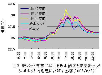 図2 紙ポット育苗における散水頻度と底面給水方法がポット内地温に及ぼす影響(2005/8/8)