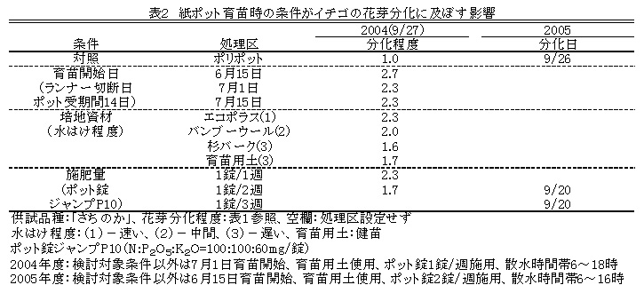 表2 紙ポット育苗時の条件がイチゴの花芽分化に及ぼす影響