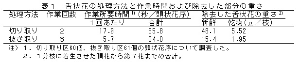 舌状花を抜き取る方法と切り取る方法の作業時間は同程度である(表1)。作業により除去される舌状花の重さは、切り取る方法のほうが大きい。