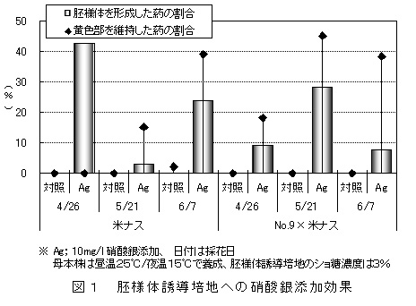 - 胚様体誘導培地に10mg/リットルlの硝酸銀を添加することにより黄色部を維持する葯の割合が高まり、胚様体形成率が向上する(図1)。