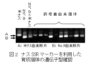 遺伝子型の確認は、野菜茶業研究所機能解析部育種工学研究室で開発されたナスSSRマーカーを利用した。