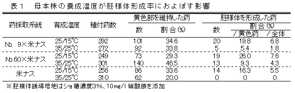 葯を採取する母本株を昼温摂氏25度、夜温摂氏15度程度の生育適温で養成することで、昼温摂氏35度、夜温摂氏25度の高温条件で養成した場合に比べ胚様体形成が促進される(表1)。このような温度管理により、周年的に効率的な半数体の作出ができる。