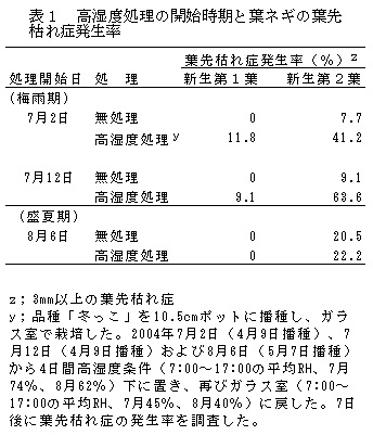 ガラス室で栽培した葉ネギを高湿度条件下に4日間置き、再び低湿度のガラス室に戻すことで湿度を急変させると、7月上旬の梅雨期に栽培した葉ネギでは葉先枯れ症の発生が助長される。しかし、8月上旬の盛夏期に栽培した葉ネギでは湿度を急変させても葉先枯れ症の発生は助長されない(表1)。