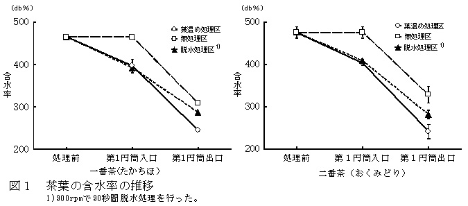 濡れ葉を葉温め処理して炒り葉機に投入することで炒り葉機第1円筒出口では茶葉の含水率が約250%(DB)となり、無処理または脱水処理した場合と比較して良好な炒り葉が行える(図1)。