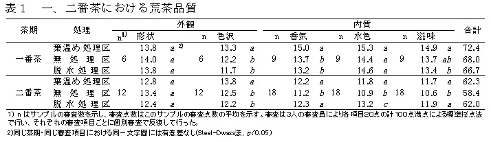 荒茶品質については、濡れ葉を葉温め処理して製造を行うことで、無処理または脱水処理した場合と比較して色沢等が良好となる(表1)。