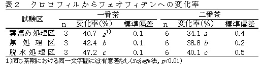 濡れ葉を葉温め処理した場合、無処理及び脱水処理した場合と比較してクロロフィルからフェオフィチンへの変化率が低くなる(表2)。