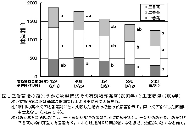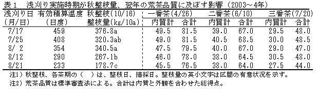 荒茶品質については、三番茶後の浅刈りから秋整枝までの摂氏20度を基準とする有効積算温度が400日度以上で内質が優れる(表1)。
