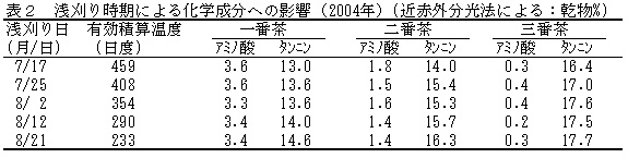 化学成分含有量は、茶期に関わらず、浅刈りから秋整枝までの有効積算温度が少ないほどタンニンは多い傾向があり、逆にアミノ酸は少ない傾向がある(表2)。