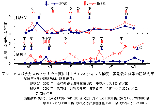 - アスパラガス半促成長期どり栽培の重要害虫のひとつにアザミウマ類(主にネギアザミウマ)がある。現在、本種に対しては化学農薬による防除が中心であるが、登録農薬は少なく、防除に苦慮している。また、一方では、環境保全型農業や減農薬栽培技術の要望が高まっている。このため、各種物理的防除法も検討され、ポット植えのアスパラガスを用いて、施設の近紫外線除去フィルム(以下、UVAフィルム)被覆が、本種の密度抑制に有効であることが明らかにされている(香川農試、2001)。そこで、UVAフィルムを活用したアザミウマ類の効率的な総合防除体系を構築するため、本フィルムを被覆した半促成長期どり栽培のアスパラガス圃場において、本種の密度推移を調査し、その効果の特性を明らかにする。また、松本ら(1999)の要防除水準を目安にした薬剤防除を組み合わせて行い、薬剤の使用回数低減の可能性を検討する。
