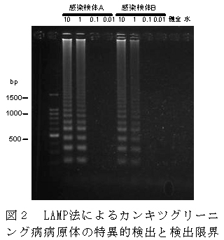 図2 LAMP法によるカンキツグリーニング病病原体の特異的検出と検出限界
