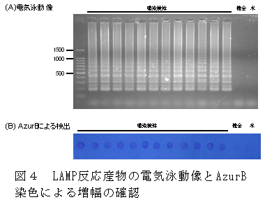 図4 LAMP反応産物の電気泳動像とAzurB染色による増幅の確認
