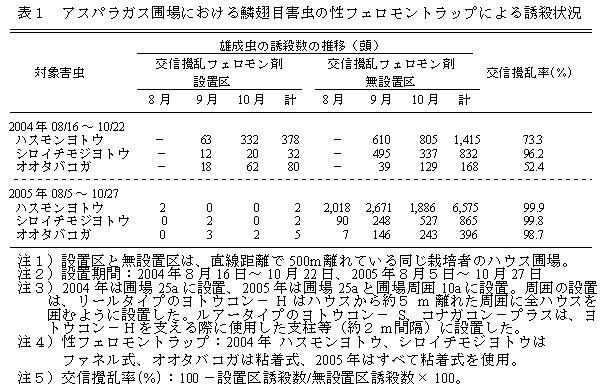 アスパラガスの半促成長期どり栽培のハウス圃場および圃場周辺部において交信攪乱フェロモン剤は、〔対ハスモンヨトウ「ヨトウコン-H」;200m/10a〕、〔対シロイチモジヨトウ「ヨトウコン-S」;700本/10a〕、〔対オオタバコガ「コナガコンープラス」;120本/10a〕、幼虫発生前からの設置によって、高い交信攪乱効果を示し、無設置に比較して誘殺数が激減する(表1)。