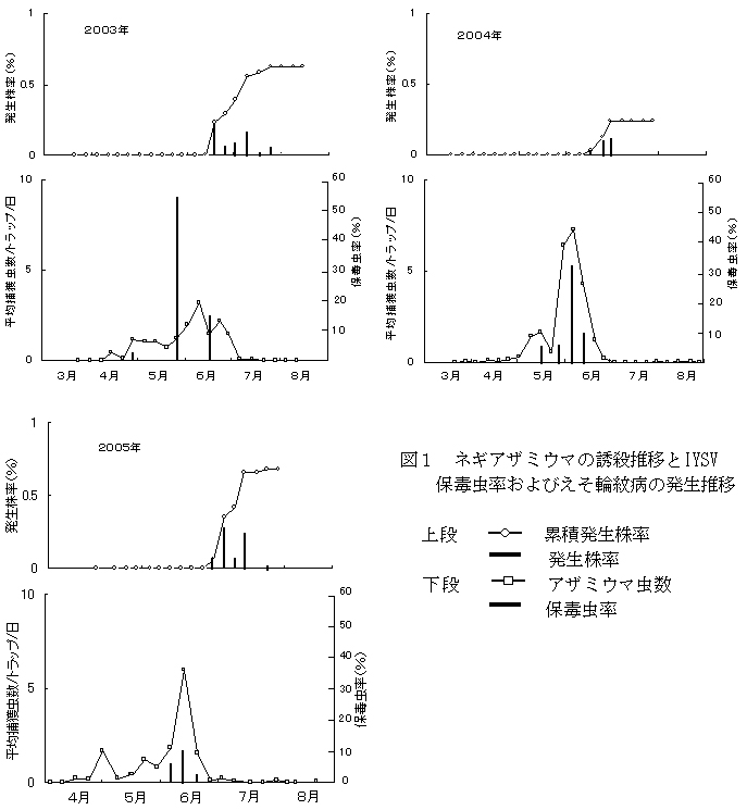 図1 ネギアザミウマの誘殺推移とIYSV保毒虫率およびえそ輪紋病の発生推移