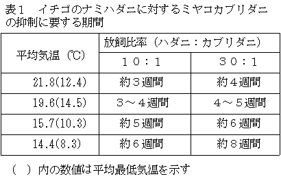 表1 イチゴのナミハダニに対するミヤコカブリダニの抑制に要する期間