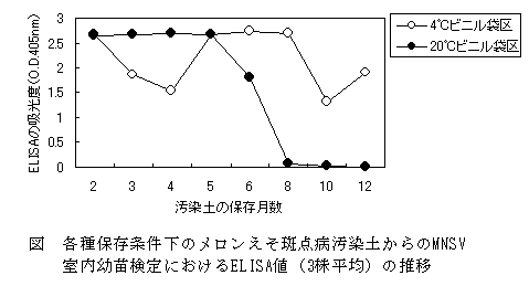 病原ウイルス(MNSV)は、汚染土の含水率の低下に大きな影響を受け、摂氏20度風乾条件下では保存2ヶ月後には活性を失する。また、温度の影響は比較的受けないが、半年間以上の長期保存では、摂氏20度下より摂氏4度下で安定して病原性を保持する(表2、図1)。