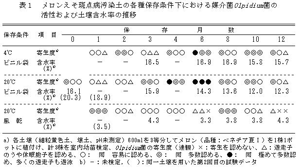 表1 メロンえそ斑点病汚染土の各種保存条件下における媒介菌Olpidium菌の活性および土壌含水率の推移
