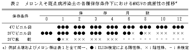 表2 メロンえそ斑点病汚染土の各種保存条件下におけるMNSVの病原性の推移a)