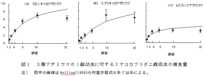 図1 3種アザミウマの1齢幼虫に対するミヤコカブリダニ雌成虫の補食量