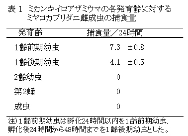 ミヤコカブリダニが捕食可能なアザミウマ類の発育齢を明らかにするため、ミカンキイロアザミウマの各発育齢について調査したところ、孵化から24時間以内の1齢幼虫を7.3頭、孵化後24時間から48時間の1齢幼虫を4.1頭を捕食する。2令幼虫、第2蛹、成虫の捕食は認められない(表1)。