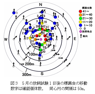 5月(2005年5月21日)の試験時には放飼日の日平均風速2.2m/s、日平均風向SSWで、放飼1日後にはゲッキツ上で確認された標識虫数は516個体(放飼数の2.58%)である。そのうち79.5%の個体が放飼地点から風下にあたる北側の地点で確認され、最も移動した個体は北側の350m地点、1個体の平均移動距離は79.8mである(図3)。