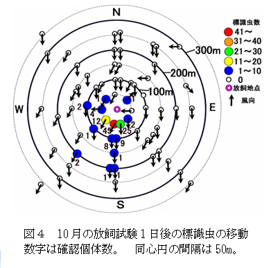 10月(2005年10月15日)の試験時には放飼日の日平均風速5.8m/s、日平均風向NNEで、放飼1日後にはゲッキツ上で確認された標識虫数は118個体(放飼数の0.59%)である。そのうち96.6%の個体が放飼地点から風下にあたる南側の地点で確認され、最も移動した個体は南側の200m地点、1個体の平均移動距離は66.9mである(図4)。