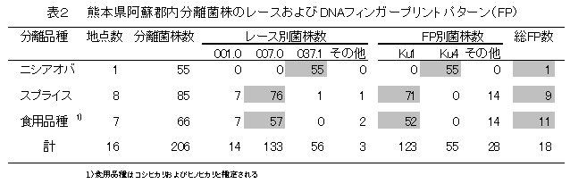 表2 熊本県阿蘇郡内分離菌株のレースおよびDNAフィンガープリントパターン(FP)