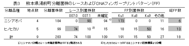 表3 熊本県湯前町分離菌株のレースおよびDNAフィンガープリントパターン(FP)