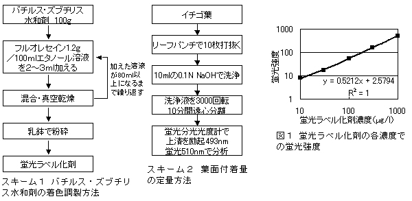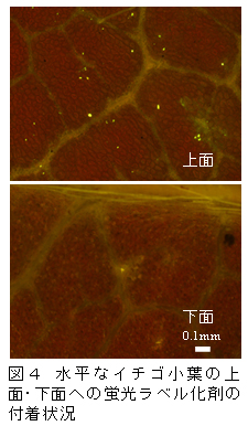 図4 水平なイチゴ小葉の上面・下面への蛍光ラベル化剤の付着状況
