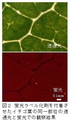 図2 蛍光ラベル化剤を付着させたイチゴ葉の同一部位の透過光と蛍光での観察結果