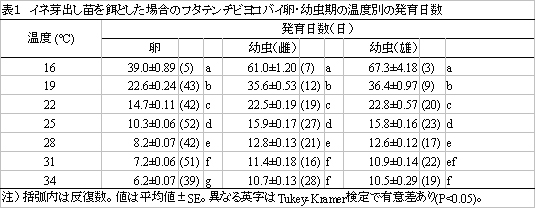 表1 イネ芽出し苗を餌とした場合のフタテンチビヨコバイ卵・幼虫期の温度別の発育日数