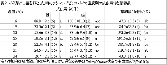 表2 イネ芽出し苗を餌とした時のフタテンチビヨコバイの温度別の成虫寿命と蔵卵数