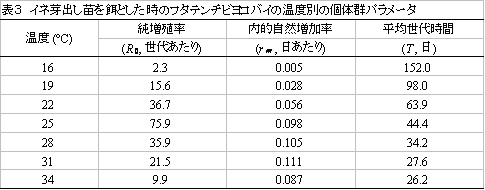 純増殖率は摂氏25度で最大、内的自然増加率は摂氏31度で最大である(表3)。