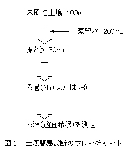 土壌診断は未風乾土に2倍量の蒸留水を加えて抽出、ろ過した後のろ液について硝酸イオン試験紙と小型反射式光度計を用いて行う(図1)。