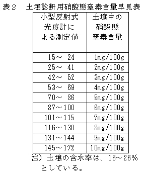 表1 ホウレンソウ露地栽培における2回目の追肥施用時の土壌中硝酸態窒素含量と収量および硝酸イオン濃度