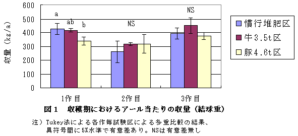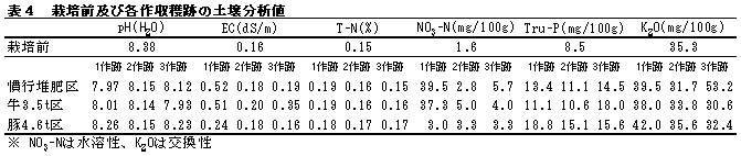 牛3.5t区の収量(結球重)は三作を通して慣行堆肥区や豚ふん堆肥区と同等かそれ以上であるが、3作跡地土壌の交換性カリは若干減少した(図1、表4)。