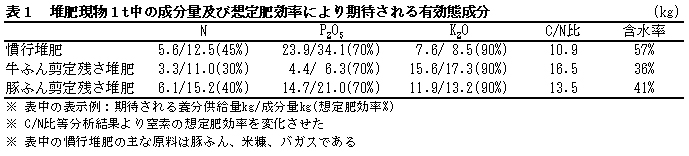 表1 堆肥現物1t中の成分量及び想定肥効率により期待される有効成分