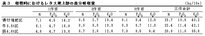 カリを基準に考え、レタス三作分に必要なカリ55kg/10aを堆肥で供給できる施用量は牛ふん堆肥で3.5t/10a、豚ふん堆肥で4.6t/10aであった(表1、表2)。