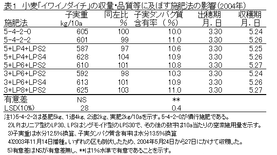 表1 小麦「イワイノダイチ」の収量・品質等に及ぼす施肥法の影響(2004年)