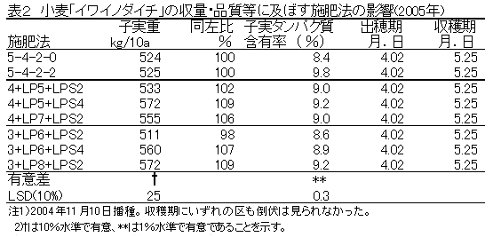 表2 小麦「イワイノダイチ」の収量・品質等に及ぼす施肥法の影響(2005年)