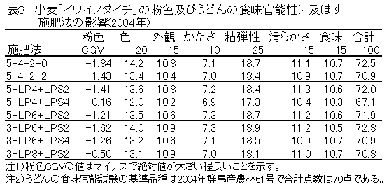 表3 小麦「イワイノダイチ」の粉色及びうどんの食味官能性に及ぼす施肥法の影響(2004年)