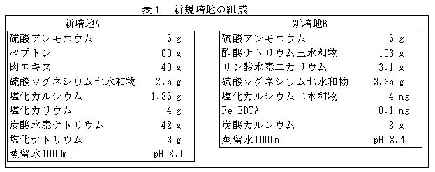 活性汚泥培地を改良した硝化細菌培養培地(新培地A)を表1に示す。この計数培地は、ペプトン0.6g、肉エキス0g、炭酸水素ナトリウム7.5gに改変して作製する。