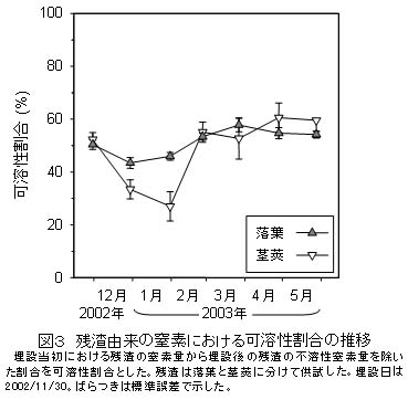 ダイズ残渣を土壌に埋めると、コムギ作当初、窒素の有機化がおき、コムギによって利用されにくくなるが、3月以降、窒素は無機化される(図3)。また、ダイズ残渣に含まれる約半分の窒素はコムギ作期間中に無機化されない。